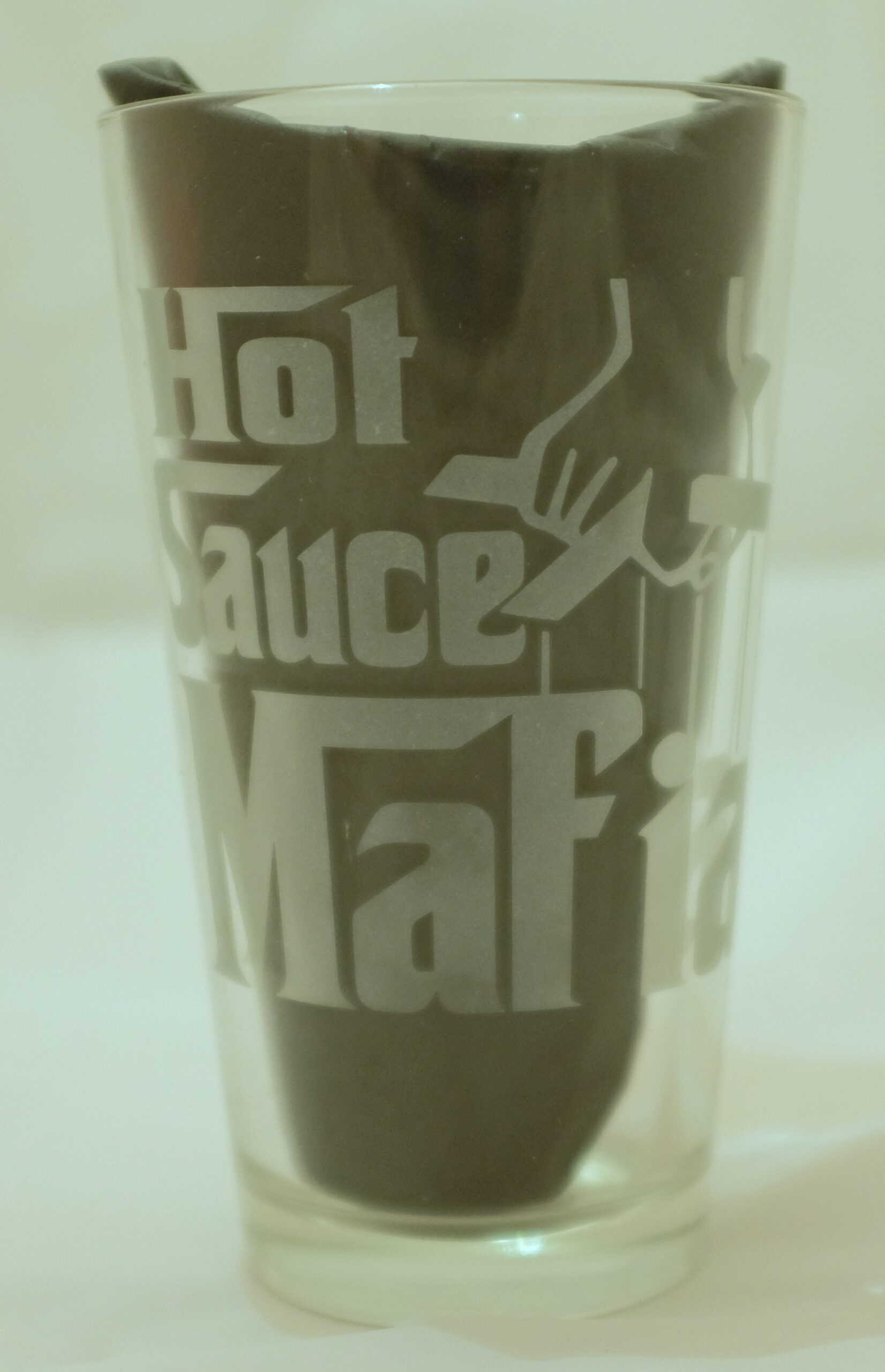 Well, why wouldn’t you want to represent your Hot Sauce Mafia tribe with our 16oz. Glass Pint Glass. Perfect for that hot sauce aficionado or even just people who like cool pint glasses.